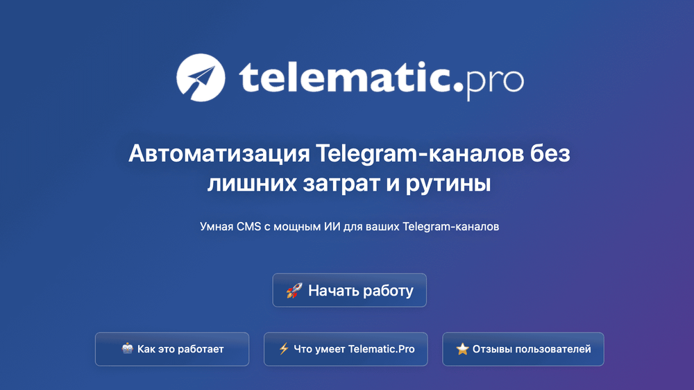Telematic.Pro — это умная платформа, которая превращает ведение Telegram-каналов из рутины в удовольствие. Она создана для блогеров, медиа и предпринимателей, которые хотят расти, зарабатывать и освобождать своё время.